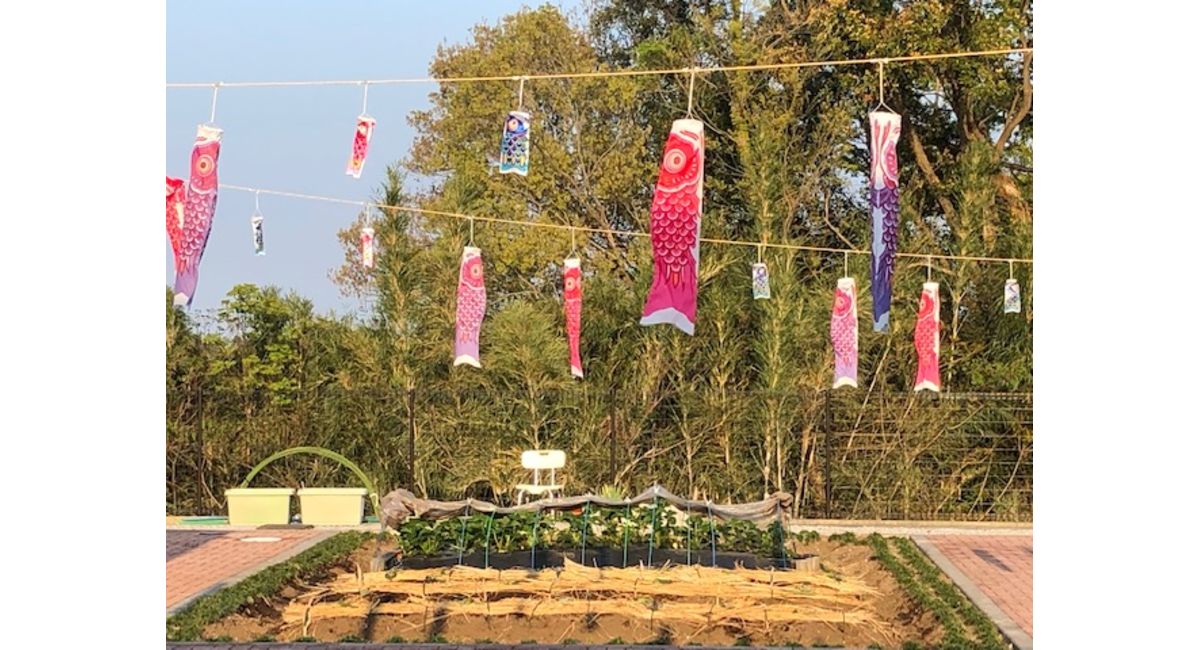 芋の苗付けやわら敷きも終わり、こいのぼりを挙げました。