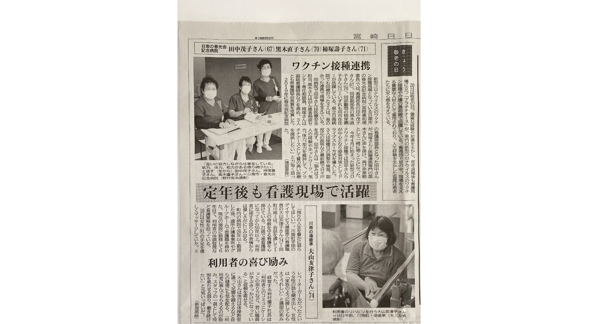 20日の宮崎日日新聞に湯癒亭のスタッフ看護職員の大山亥津子さん(74才)の記事が掲載されました。(右下)