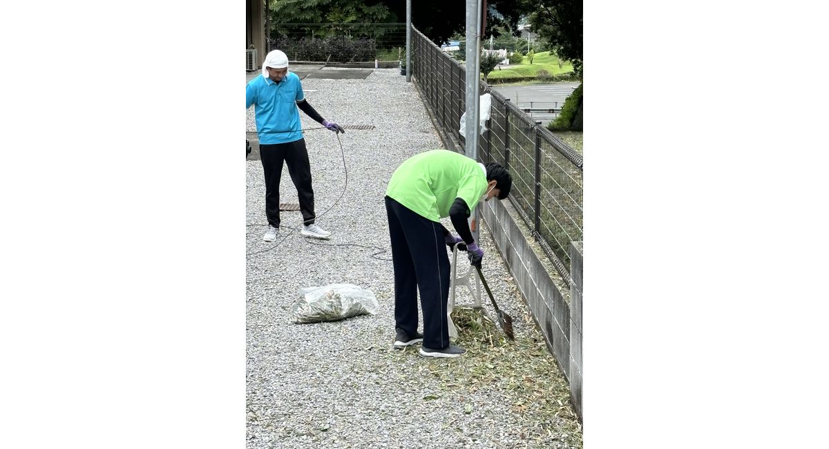 朝6時から施設の屋根から枝葉を落とし集める作業。台風が過ぎ去ると沢山のスタッフでルーティン作業、段々綺麗になっていきます。