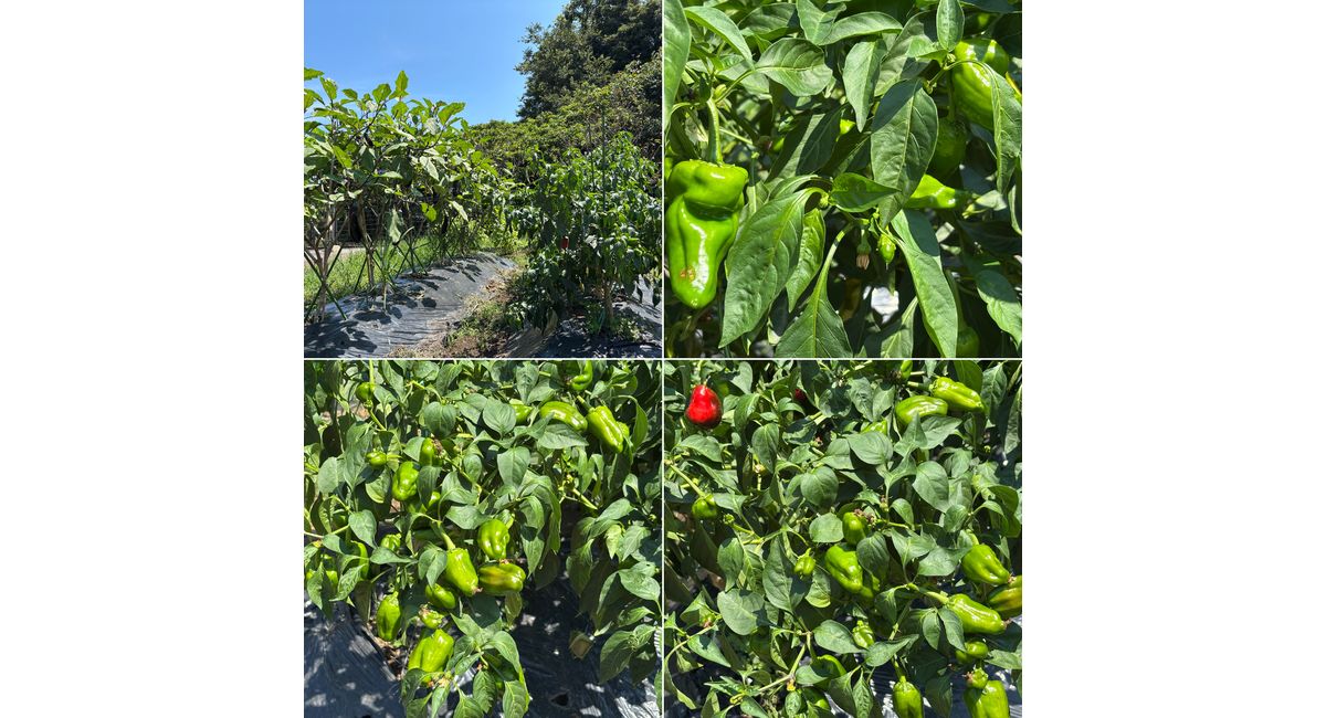 施設の中庭で育てられているピーマン🫑が鈴なりに成長しています。