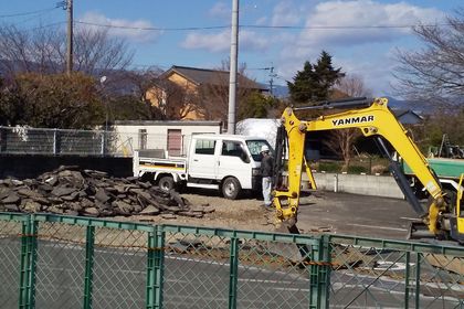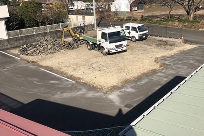 アスファルトの剥離も終わり、基礎つくり、土の掘り起こしが始まりました。 少しずつ進んでいます。