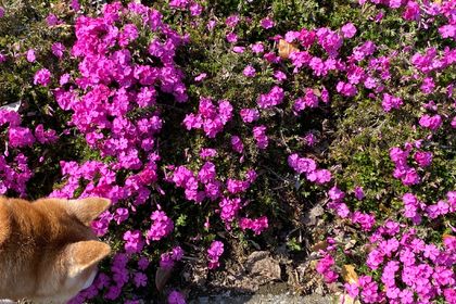 湯癒亭の施設北側に咲いた芝桜が満開になりました。 16歳になる老犬も芝桜が大好きみたいです。