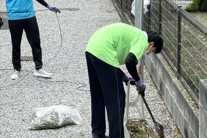 台風10号が過ぎ去り後片付け中 毎回近隣の竹林の枝葉が沢山舞入ってくる。 朝6時から施設の屋根から枝葉を落とし集める作業。台風が過ぎ去ると沢山のスタッフでルーティン作業、段々綺麗になっていきます。
