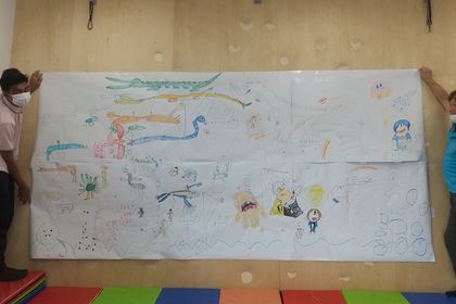 放課後等デイサービス利用の子供達がみんなで絵を書いてくれました。 アート🎨の世界は不思議で楽しい🎨 町の文化祭に向けて準備中🎨