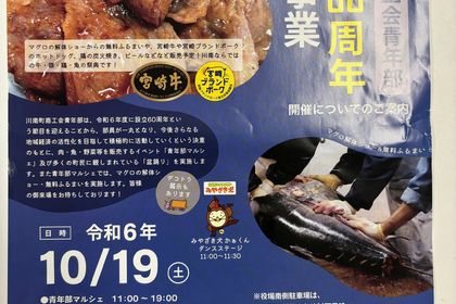 川南町商工会青年部設立60周年記念事業開催についてのご案内 令和6年10月19日(土曜日)川南町役場南駐車場開催 11:00~19:00 マグロの解体ショー(ふるまい) 宮崎牛や宮崎ブランドポークのホット...