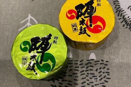 陣太鼓 昔の戦場で軍隊の合図のために打つ太鼓 その太鼓をかたどったお菓子をお土産で頂きました。 発売65周年を迎えた歴史のあるお菓子