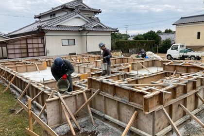 建築工事の基礎が少しずつ進んでいます。 昨日からコンクリートの注入が始まり、本日は細かい部分に手作業で注入していました。